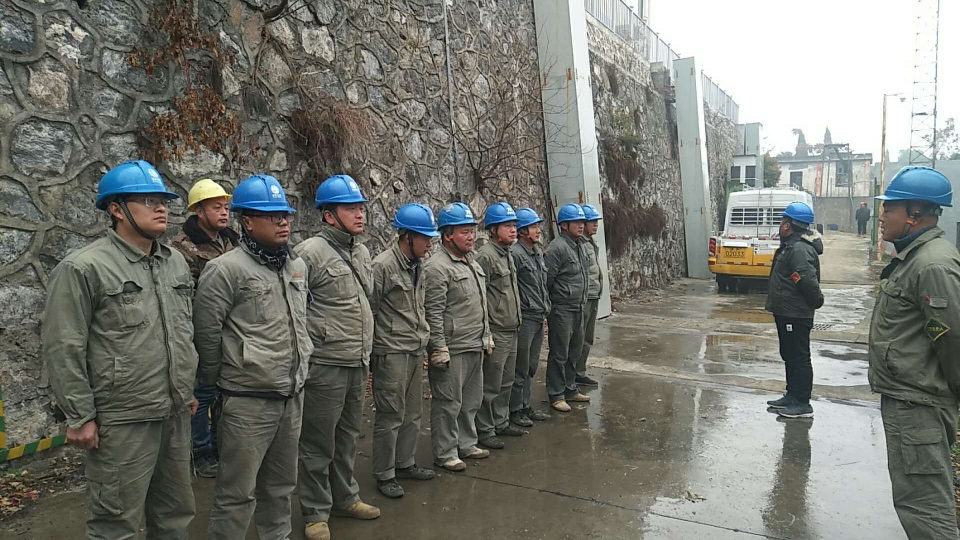 某药厂变压器增容改造现场,施工人员顶着寒风冒着冷雨召开班前会