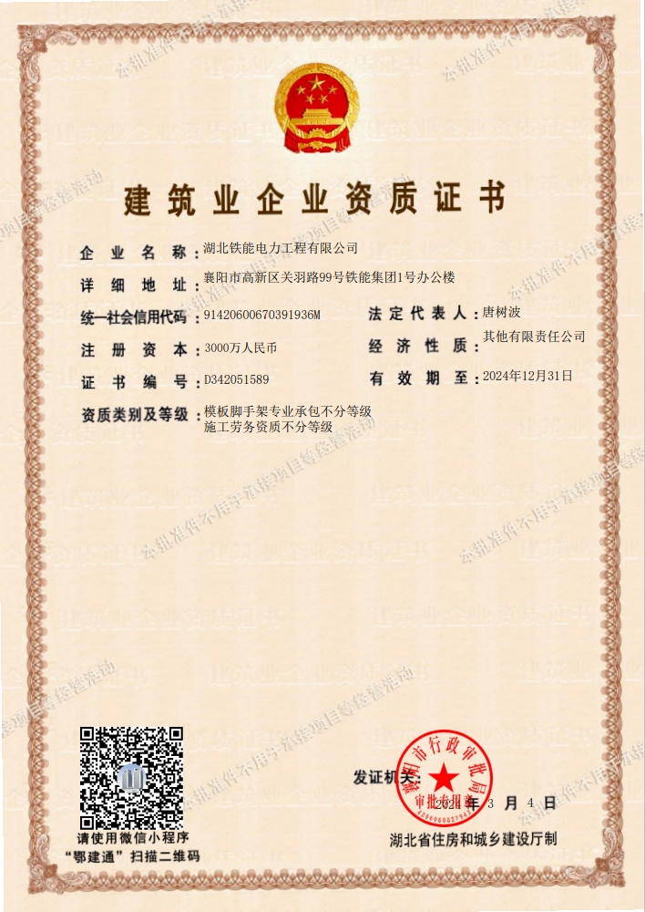 湖北铁能电力工程有限公司成立于2008年,2019年6月迁入湖北铁能电气集团,公司注册资金3000万元;可承担单项合同额不超过企业注册资本金5倍的110KV以下送电线路(含电缆工程)和同电压等级变电站工程的施工;电力线路维修、检修;送变电工程施工,房屋建筑工程施工,地基与基础工程施工,土石方工程施工;电力工程咨询服务。